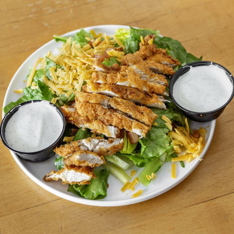hand battered buttermilk chicken, romaine, tomato, cheddar jack cheese, and house ranch.